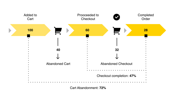 Cart abandonment is a significant issue, with an average rate of 72%. Out of 100 customers who add products to their cart, only 28 complete their purchase, leading to over $6.5 trillion in abandoned merchandise annually.